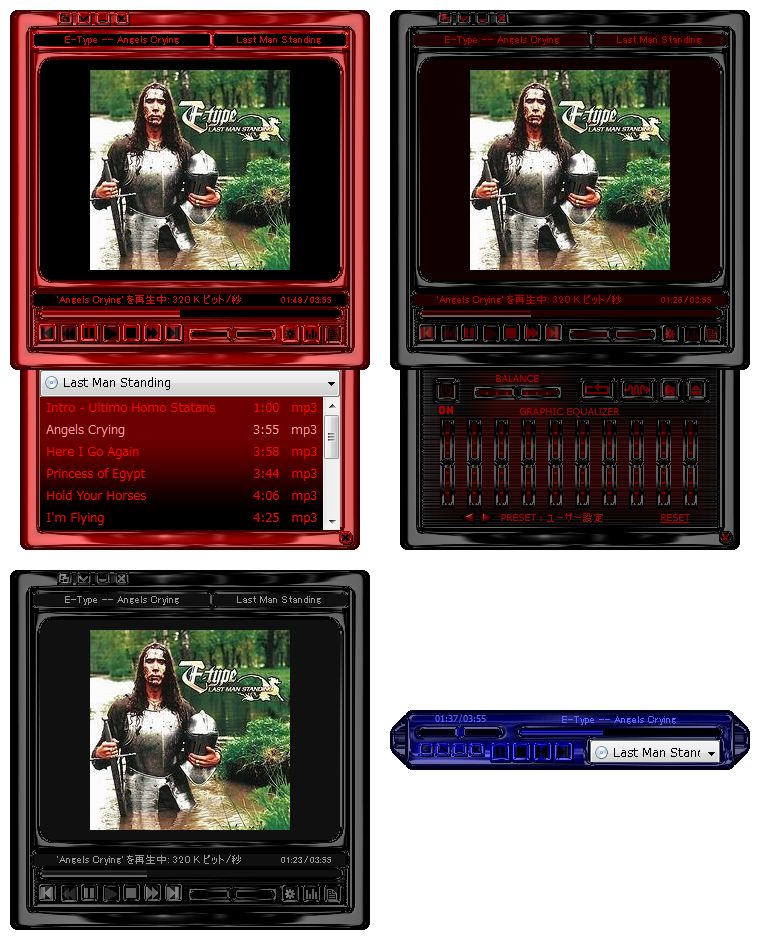 四角Wver2.01 2010/06/05 更新版UP (2003/09/21初版UP) サブビュー部分はイコライザ、プレイリストに切り替え出来ます。 変更でスキンの色を変えられる様にしました。 |